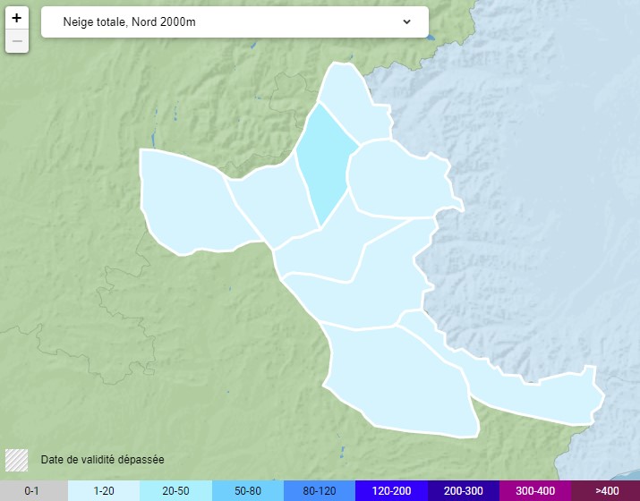 Météo France vous propose un outil qui permet de connaitre le niveau d’enneigement en cm / mètre dans tous les massifs Français : Alpes du nord et du sud, Massif Central, Jura, Vosges, Corse, Pyrénées.